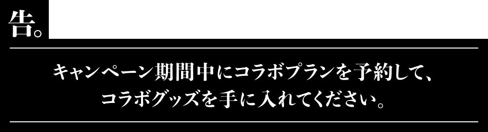 キャンペーン期間中にコラボプランを予約して、コラボグッズを手に入れてください。キャンペーン期間中にコラボプランを予約して、コラボグッズを手に入れてください。