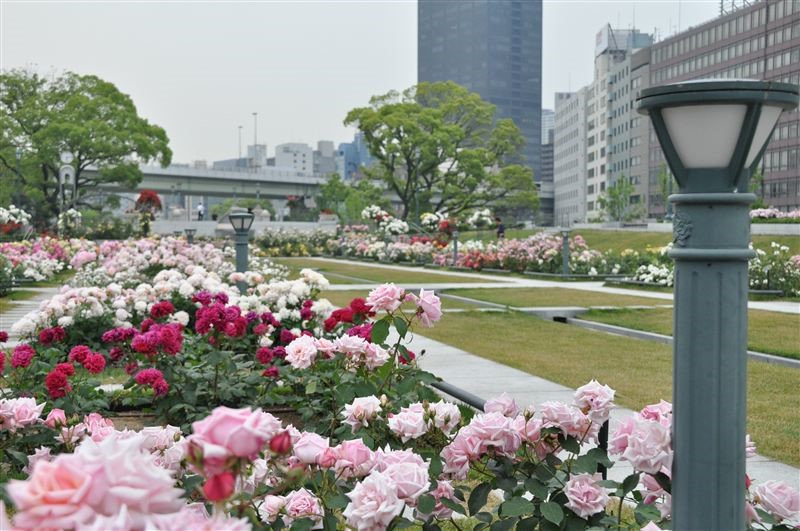 中之島公園の中央にはバラ園があり「バラの庭」「バラの小道」「バラの広場」と3つのエリアがあります。5月中旬と10月中旬が見頃で約310種のおよそ3700株の色とりどりのバラの花が公園内を彩っています。花壇には通路もありますので満開のバラの道をお散歩することもできます。バラが満開になったアーチのついたベンチは写真映えもします。