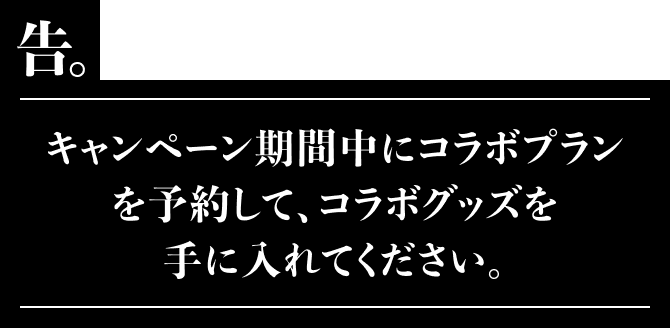 キャンペーン期間中にコラボプランを予約して、コラボグッズを手に入れてください。キャンペーン期間中にコラボプランを予約して、コラボグッズを手に入れてください。