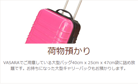 VASARAで着物をレンタルされているお客様は、手荷物1袋分を無料で預けることが可能です。また、有料オプションとして「トランクお預かりプラン(大型トランク可)」や、手荷物を追加で預けられる「追加大型バック」もご用意しています。