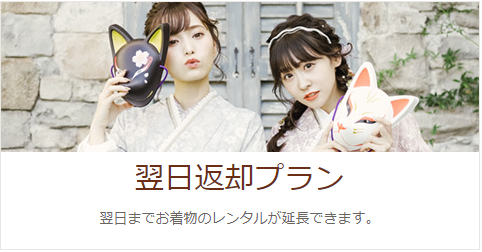 「せっかく着物で浅草デートをするなら、返却時間は気にせずゆっくりしたい!」という声にお応えして、VASARAでは「翌日返却プラン」をご用意しています。着物のレンタルを翌日の17時30分まで延長できるので、ゆっくり夜の浅草散策を楽しみたい方や、翌日も着物を着て観光したい方は利用してみてはいかがでしょうか。