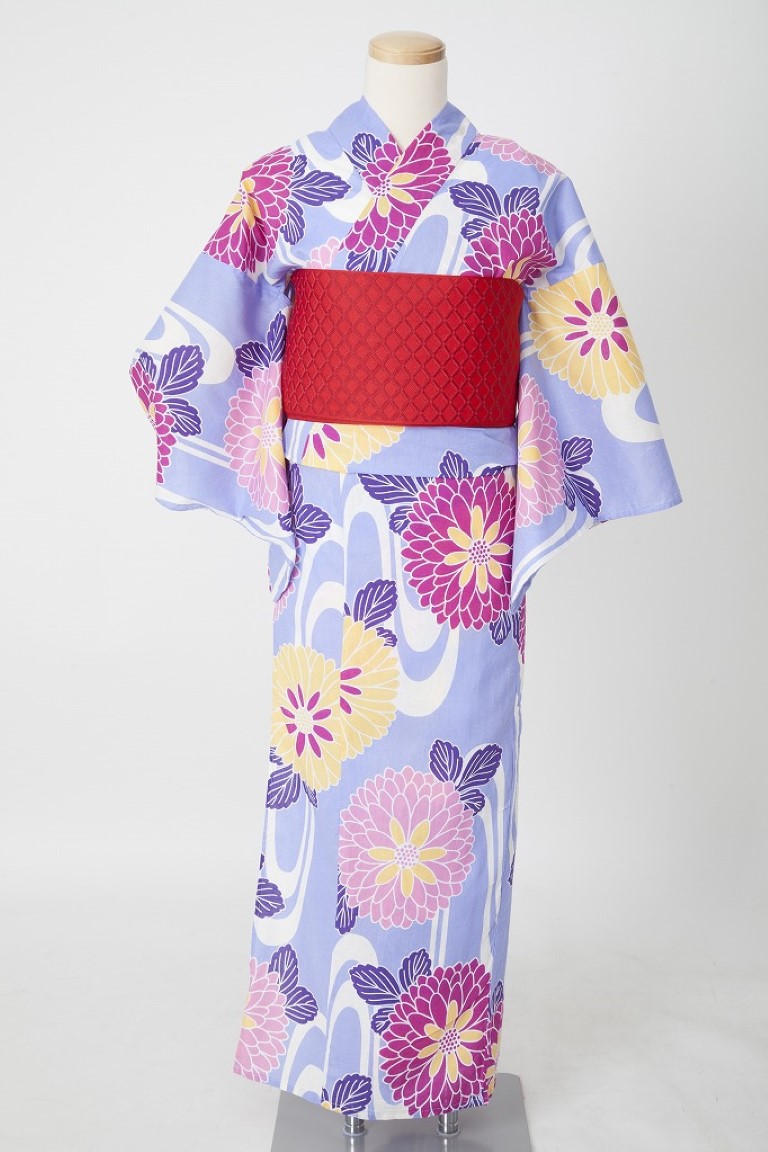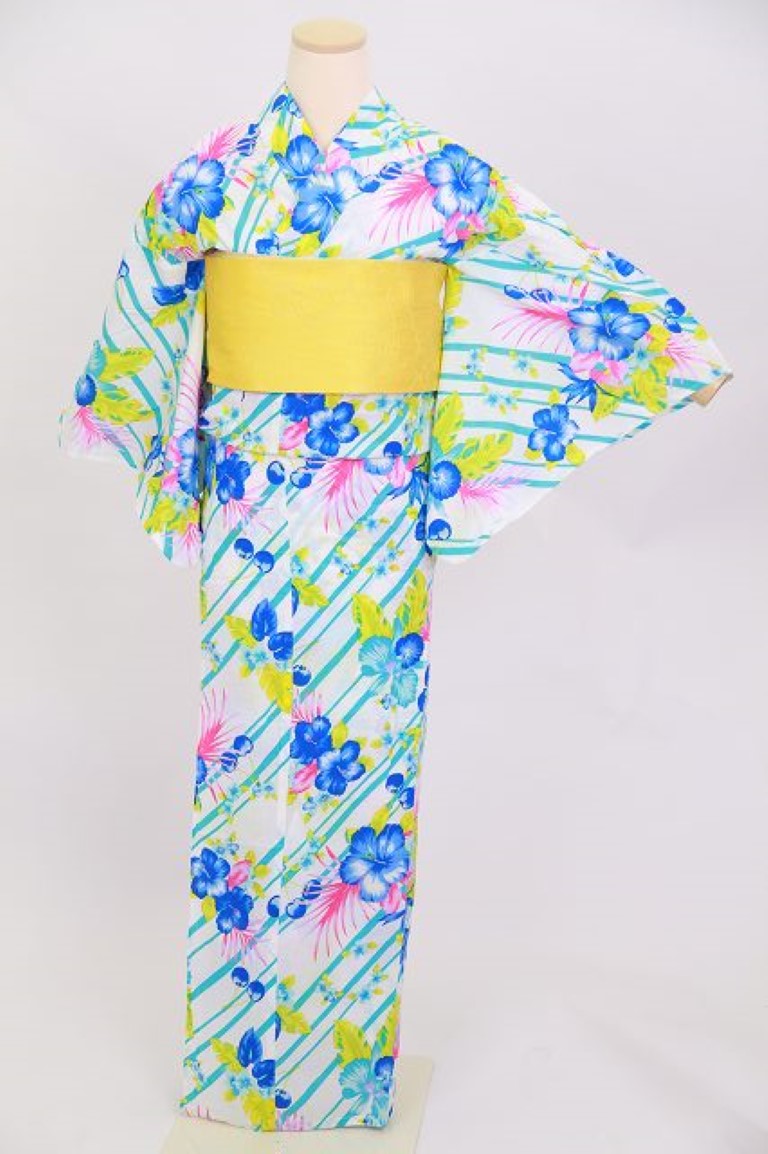 涼しげな水色をベースにしつつ、夏をイメージさせるハイビスカスの花柄が施された浴衣です。最初に紹介したハイビスカス柄の浴衣と色違いなので、友達とリンクコーデをするのもよいでしょう。