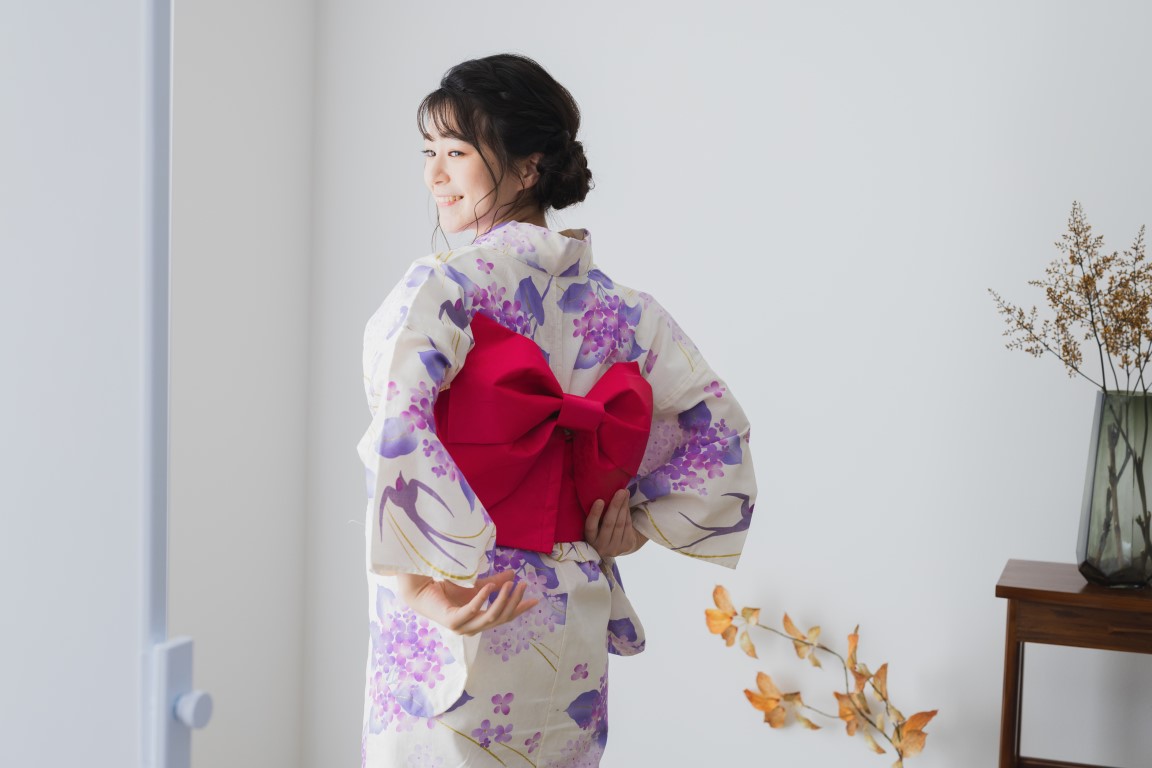 最後に、帯がずれたり緩んだりしていないかをチェックします。帯が緩んでいる場合は、帯の結び目の下辺りにハンカチを挟み込むとよいでしょう。