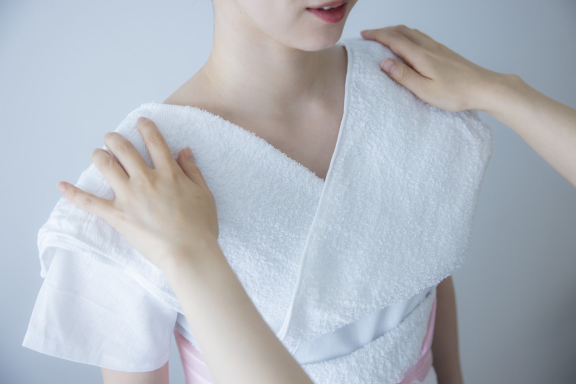 肩から胸にかけては薄手のタオルや手ぬぐいなどをV字にあてます。胸はつぶすようにして、なだらかに整えることが大事です。必要な場所に適切な補正をすることで美しさが決まります。着崩れを防ぐためにも体型の補正は欠かせません。ただし、補正が多すぎると太って見えるため注意しましょう。