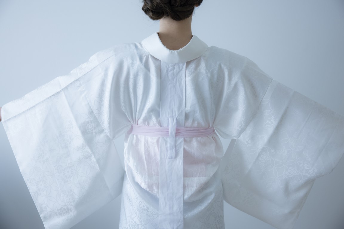 着物を羽織る前に襟幅を半分にし、背縫いの上または襟肩明あたりに付いているスナップをとめておきましょう。長襦袢の襟をつぶさないように、着物を後ろから肩にかけます。袖を通すときは長襦袢の袖を持って一緒に通すとスムーズです。左右のかけ襟を体の中心に合わせ、背中心を合わせます。